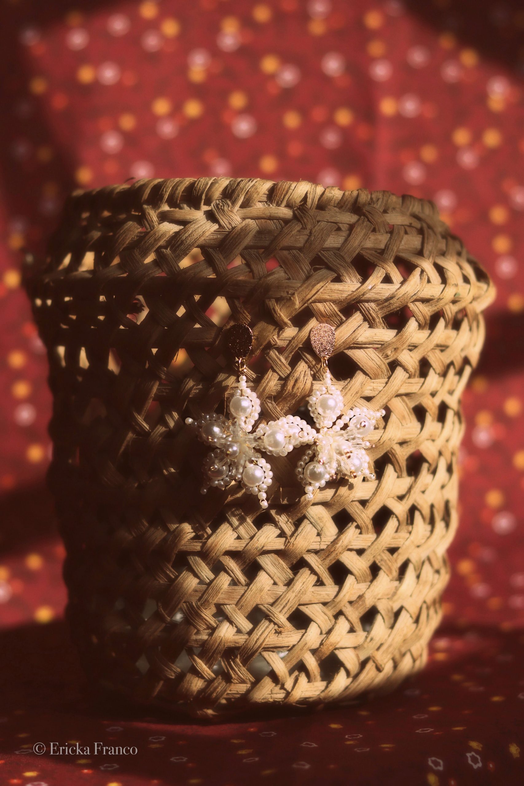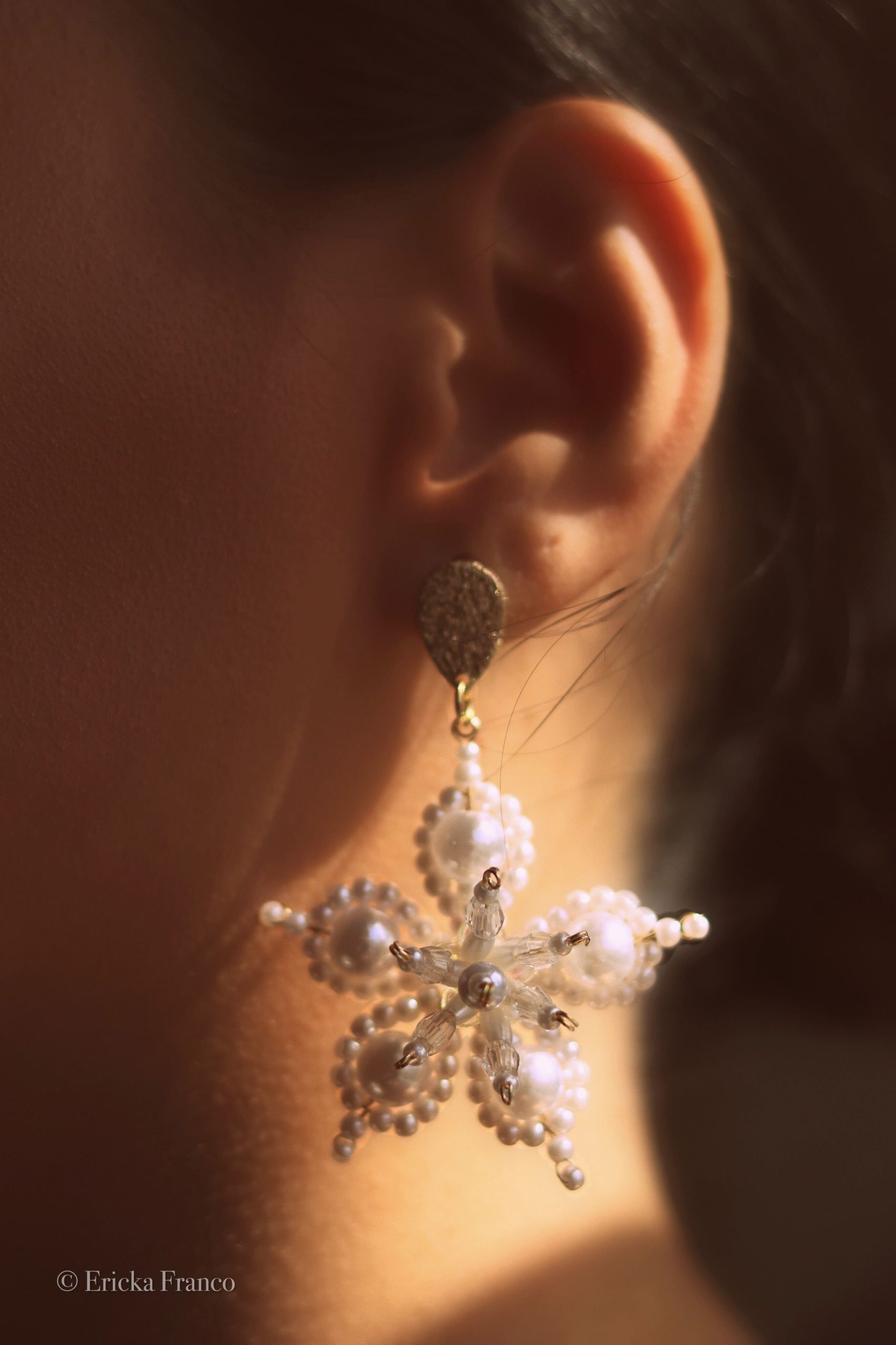 Aretes confeccionados mediante la técnica tradicional del tembleque de perlas y cristales.