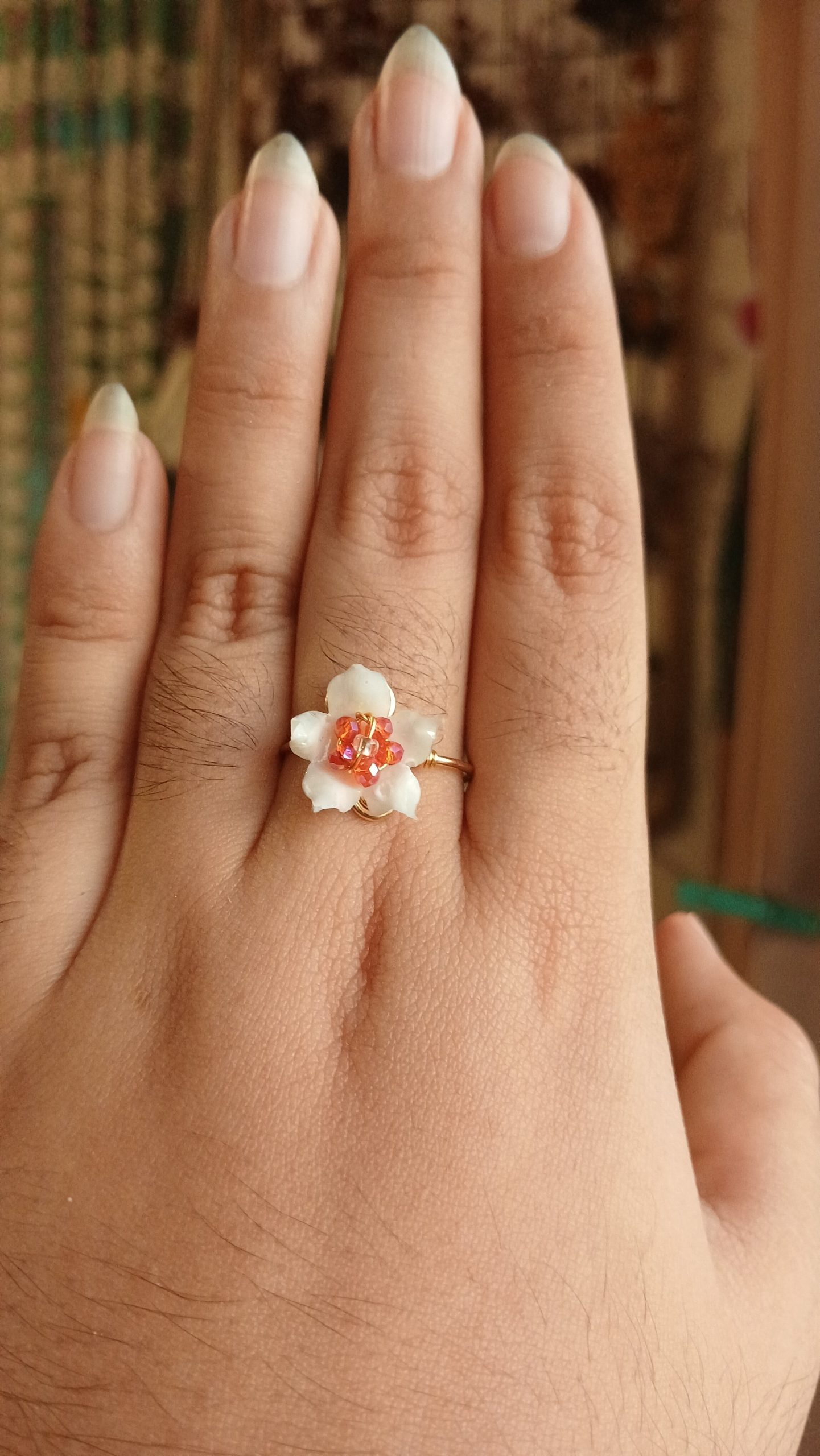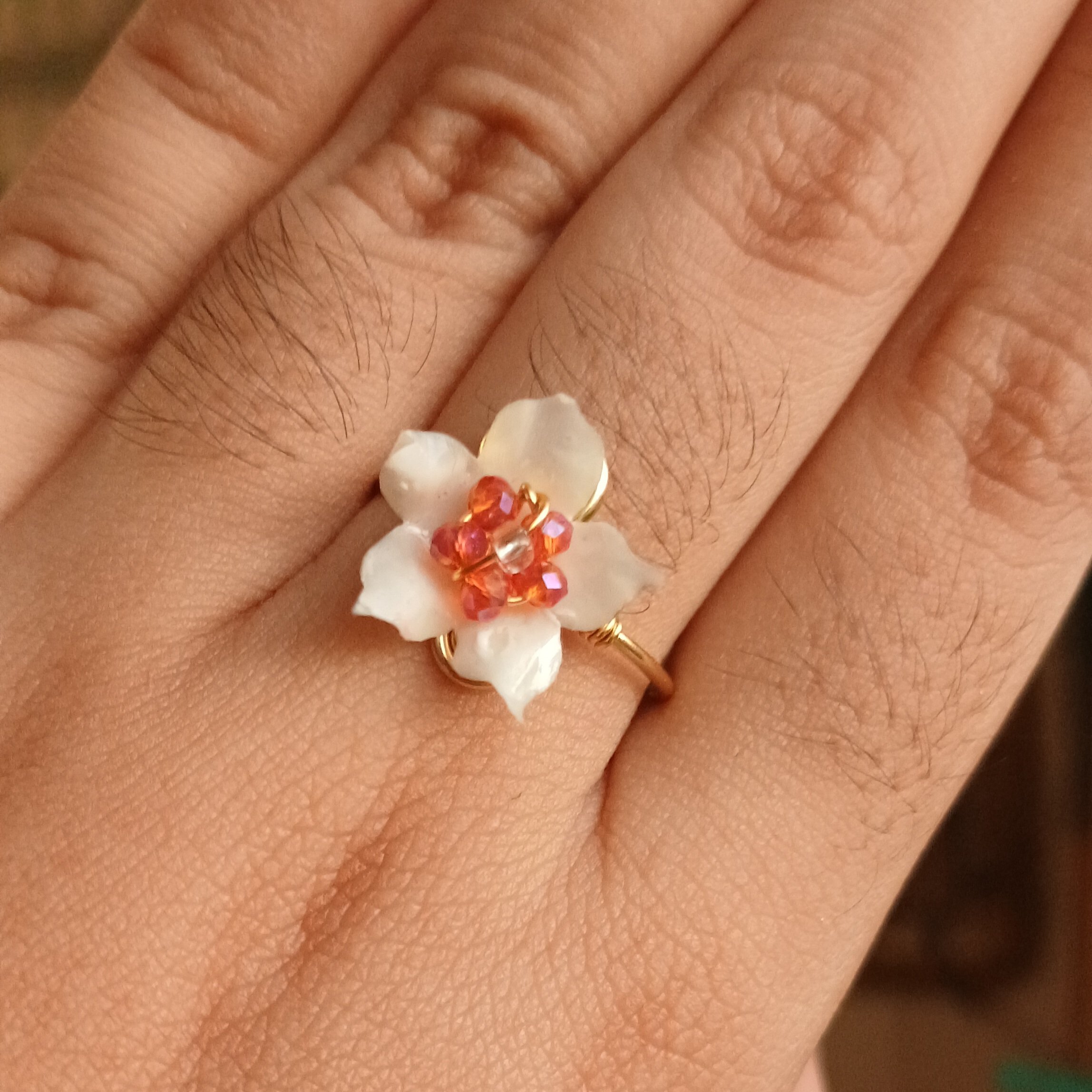 Anillo confeccionado mediante la técnica tradicional del tembleque de escamas cuidadosamente recortada y pintada para darle la forma de flor de cera, de la especie Hoya.