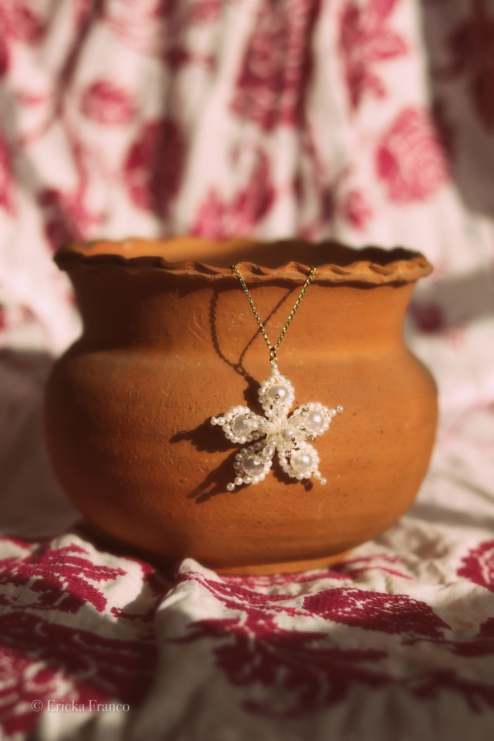 Collar confeccionado mediante la técnica tradicional del tembleque de perlas y cristales.